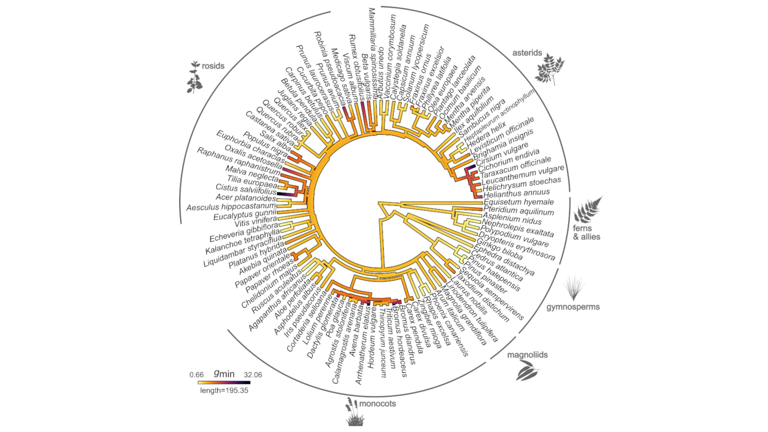 Fig1. Conductance foliaire minimale après fermeture des stomates (gmin) chez les plantes vasculaires, représentée sur un arbre phylogénétique de 101 espèces. Le gradient de couleur indique les valeurs faibles (claires) et élevées (foncées) de gmin.