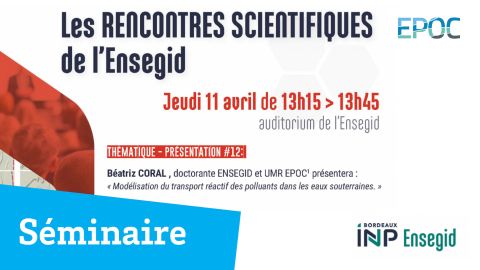 Une fuite de carburant a été détecté dans la zone de stockage d’une usine en 2015. Depuis, des actions de remédiation ont été mises en œuvre et des puits de surveillance ont été installés pour mesurer les concentrations de polluants. Un modèle de transport réactif a été développé afin de simuler la propagation du panache du BTEX (benzène, toluène, éthylbenzène et xylènes) et prédire son évolution au cours des prochaines années. Présentation de Béatrice Coral, doctorante à l'UMR EPOC. Jeudi 11 avril, 13h15.