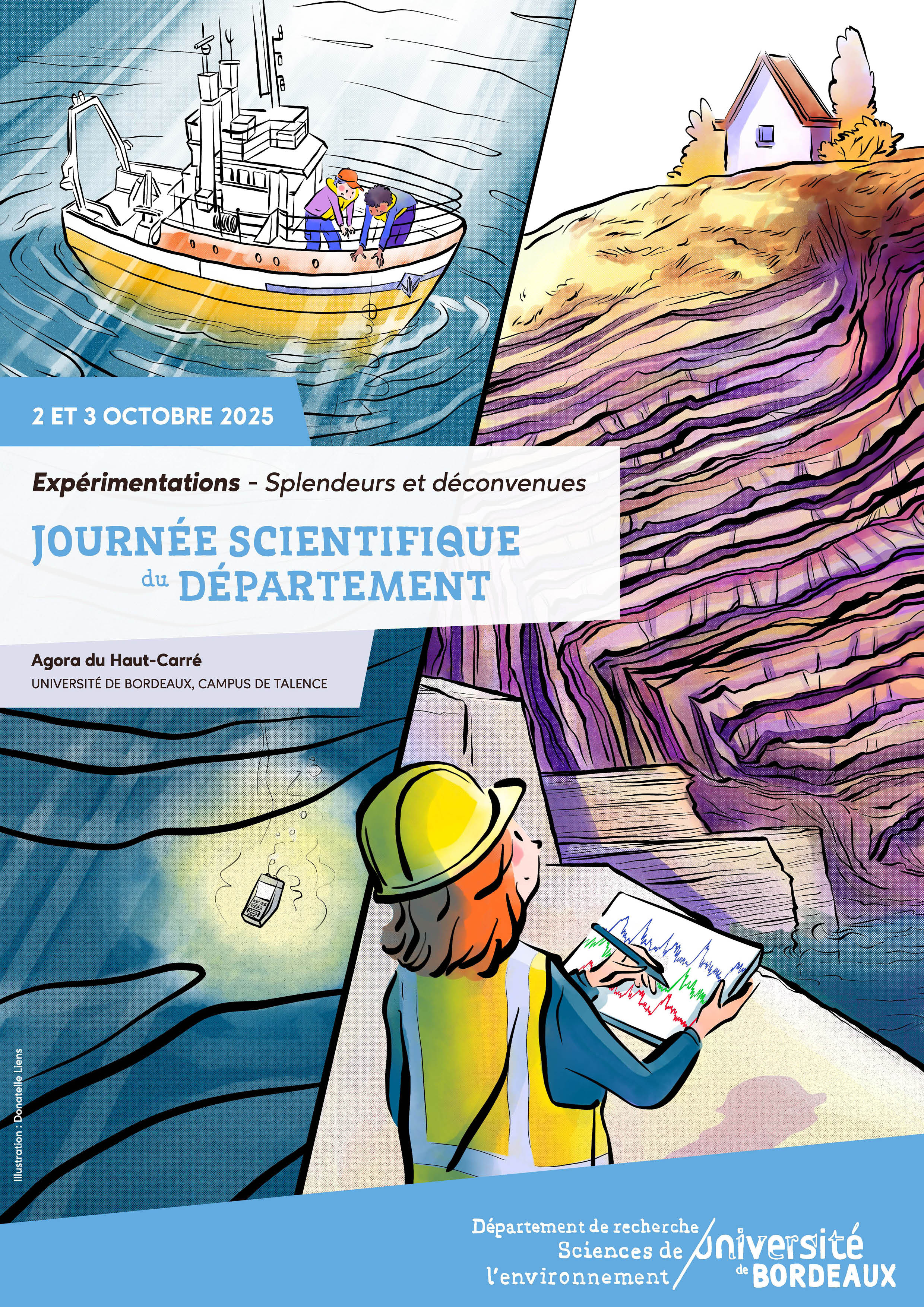 Pour l'année 2025, la Journée Scientifique du Département prévoit de s'étaler sur deux journées. Que vous veniez le 2 ou le 3 octobre, pour les deux journées ou juste une matinée, l'ensemble des laboratoires du Département s'associent pour vous proposer alternativement :