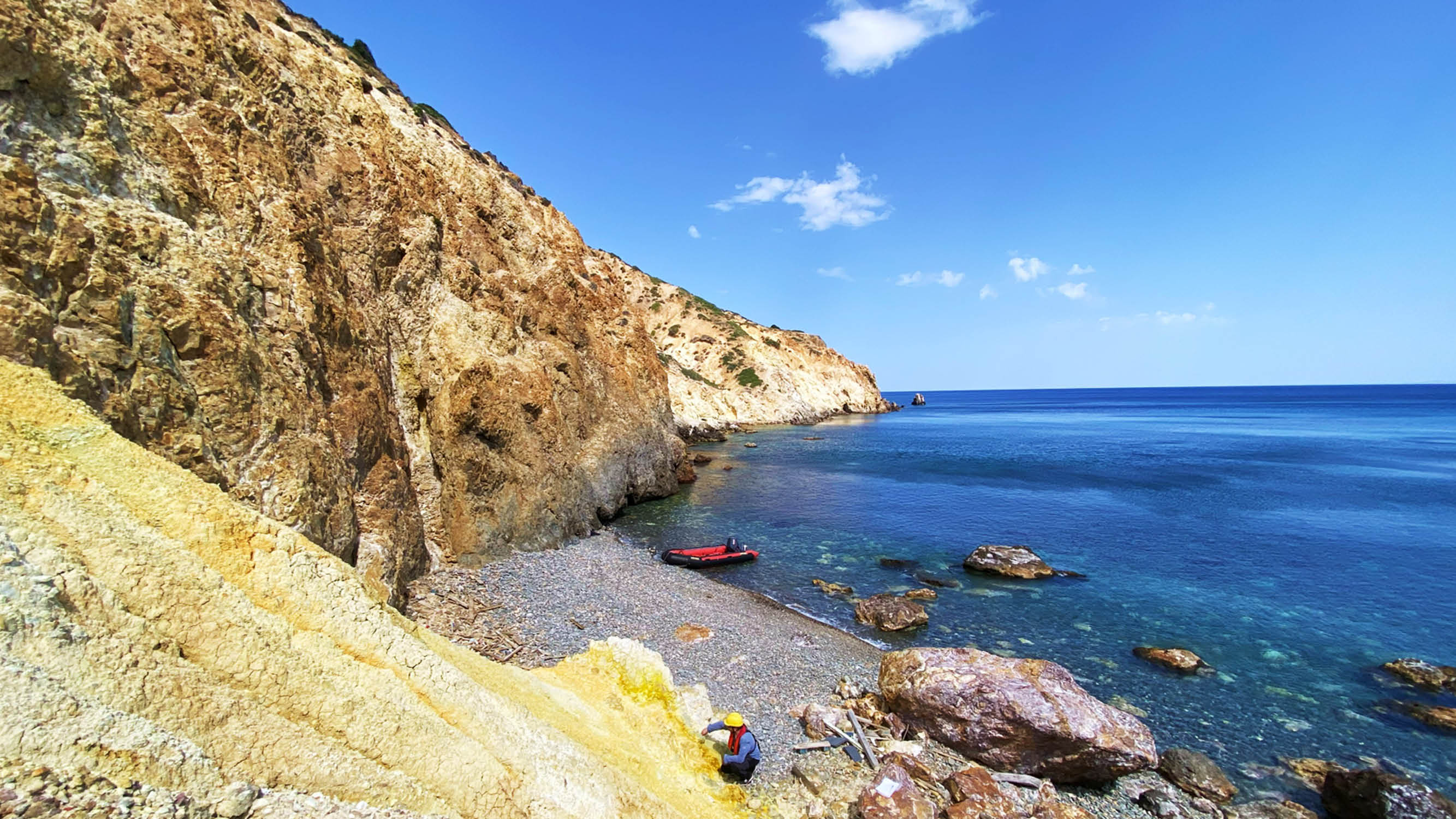 Contrastes de couleurs et de textures entre le soufre et les eaux cristallines des Cyclades.