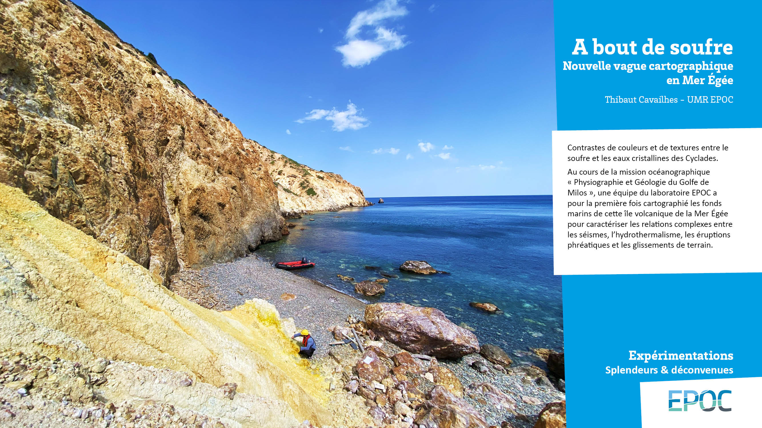 Au cours de la mission océanographique « Physiographie et Géologie du Golfe de Milos », une équipe du laboratoire EPOC a pour la première fois cartographié les fonds marins de cette île volcanique de la Mer Égée pour caractériser les relations complexes entre les séismes, l’hydrothermalisme, les éruptions phréatiques et les glissements de terrain.