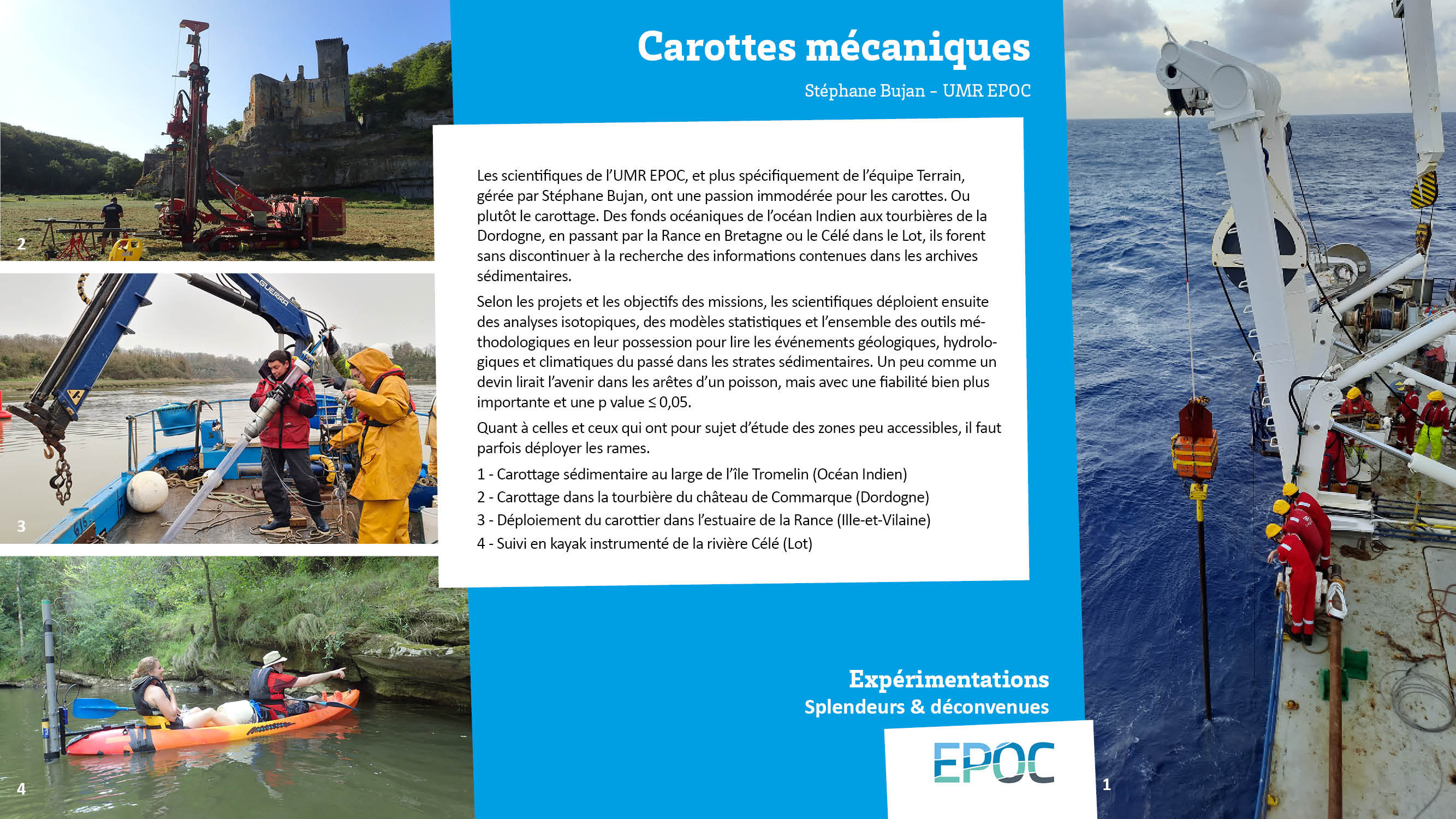 Les scientifiques de l’UMR EPOC, et plus spécifiquement de l’équipe Terrain, gérée par Stéphane Bujan, ont une passion immodérée pour les carottes. Ou plutôt le carottage. Des fonds océaniques de l’océan Indien aux tourbières de la Dordogne, en passant par la Rance en Bretagne ou le Célé dans le Lot, ils forent sans discontinuer à la recherche des informations contenues dans les archives sédimentaires.