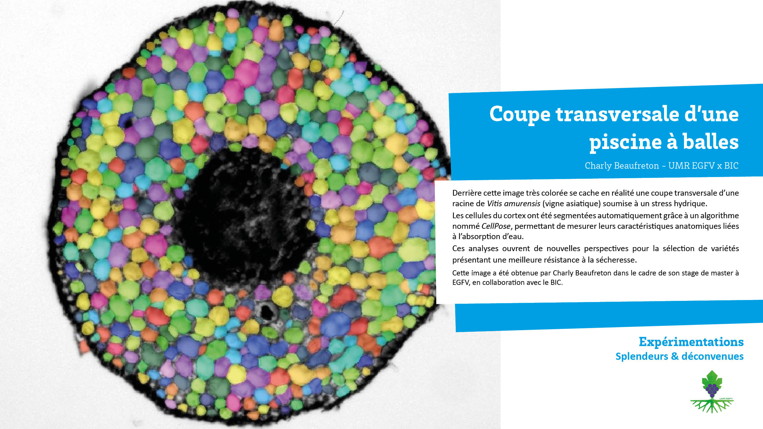 Derrière cette image très colorée se cache en réalité une coupe transversale d’une racine de Vitis amurensis (vigne asiatique) soumise à un stress hydrique. Les cellules du cortex ont été segmentées automatiquement grâce à un algorithme nommé CellPose, permettant de mesurer leurs caractéristiques anatomiques liées à l’absorption d’eau.