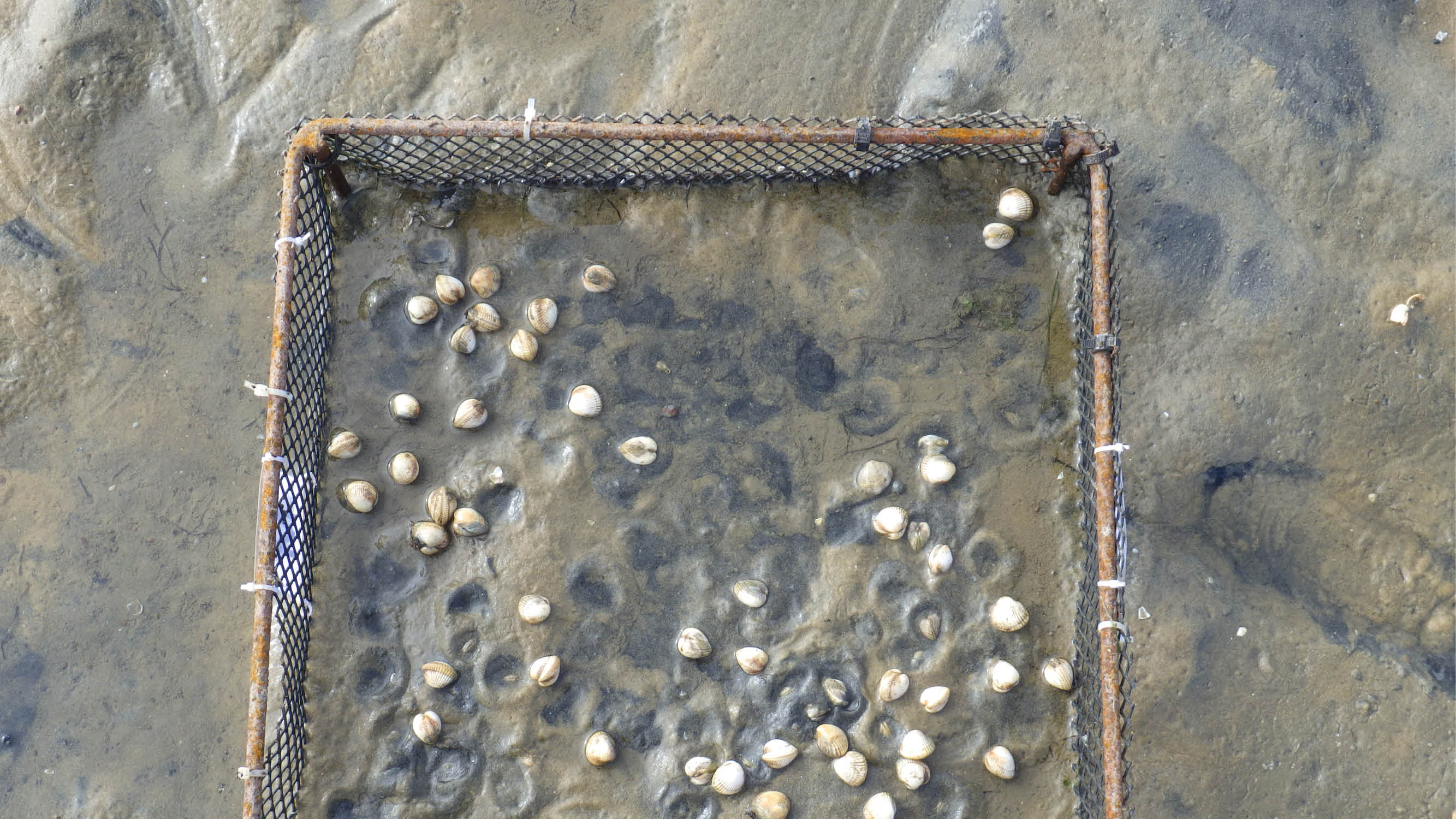 C’est pour répondre à cette question que des chercheurs et des chercheuses de la station marine d’Arcachon (UMR EPOC) ont déployé - avec l’autorisation des gestionnaires de la réserve - un dispositif expérimental spécifique dans un secteur protégé du Banc d’Arguin. Des cages ont ainsi été disposées dans une zone soumise à la marée avant d’être « garnies » de coques de manière à obtenir des niveaux de densité variant de 10 à 600 individus par m².