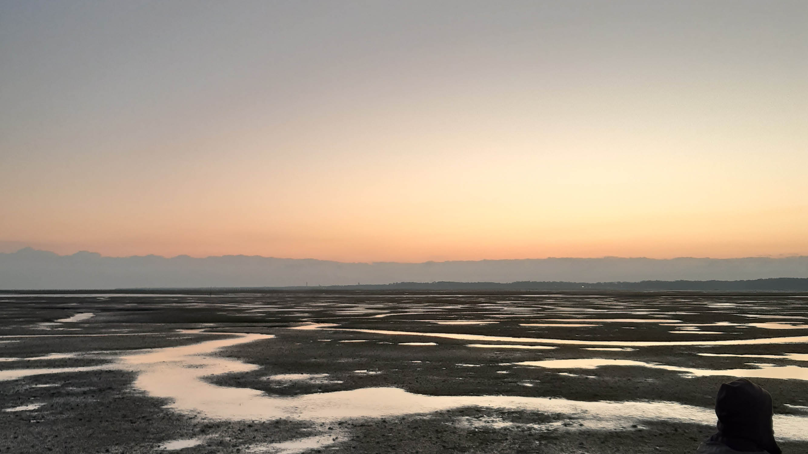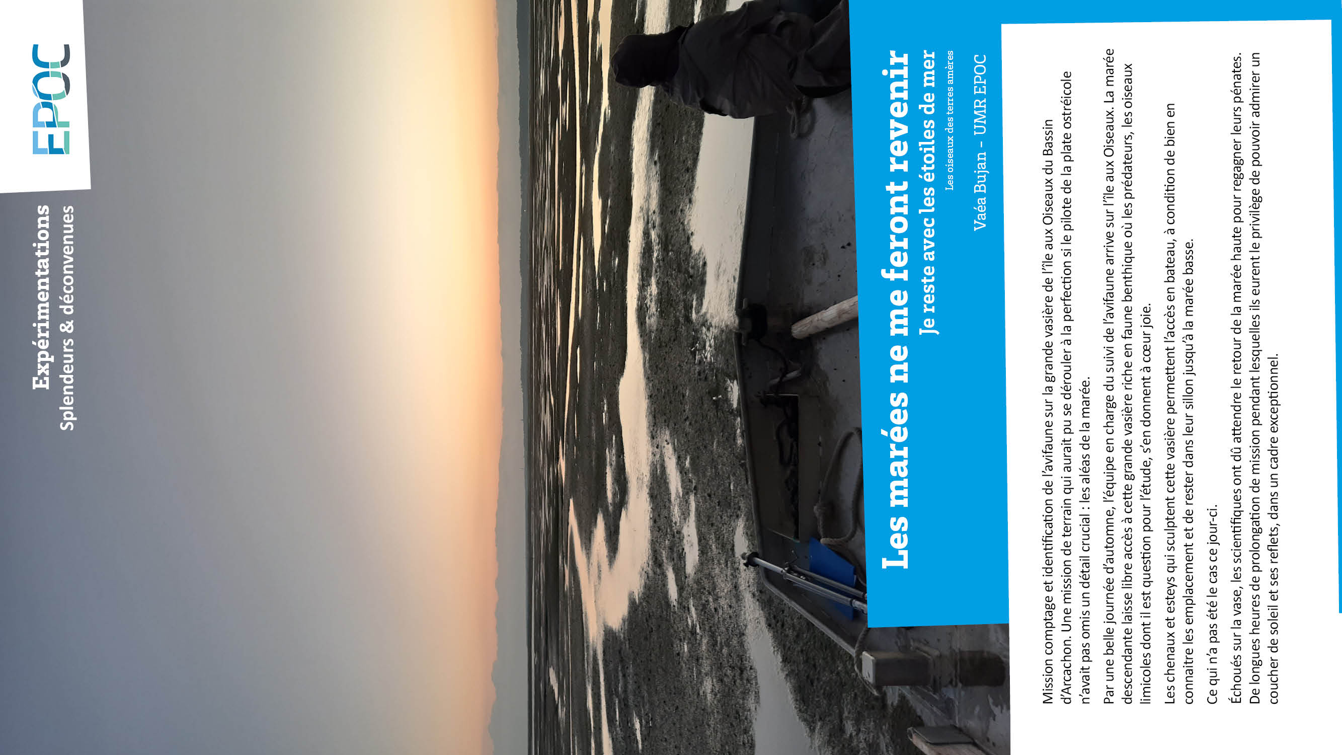 Échoués sur la vase, les scientifiques ont dû attendre le retour de la marée haute pour regagner leurs pénates. De longues heures de prolongation de mission pendant lesquelles ils eurent le privilège de pouvoir admirer un coucher de soleil et ses reflets, dans un cadre exceptionnel.