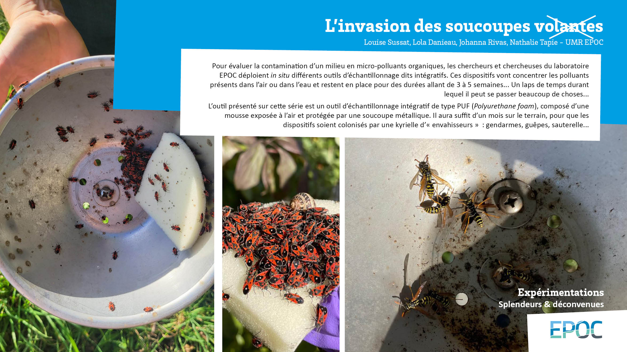 L’outil présenté sur cette série est un outil d’échantillonnage intégratif de type PUF (Polyurethane foam), composé d’une mousse exposée à l’air et protégée par une soucoupe métallique. Il aura suffit d’un mois sur le terrain, pour que les dispositifs soient colonisés par une kyrielle d’« envahisseurs » : gendarmes, guêpes, sauterelle...