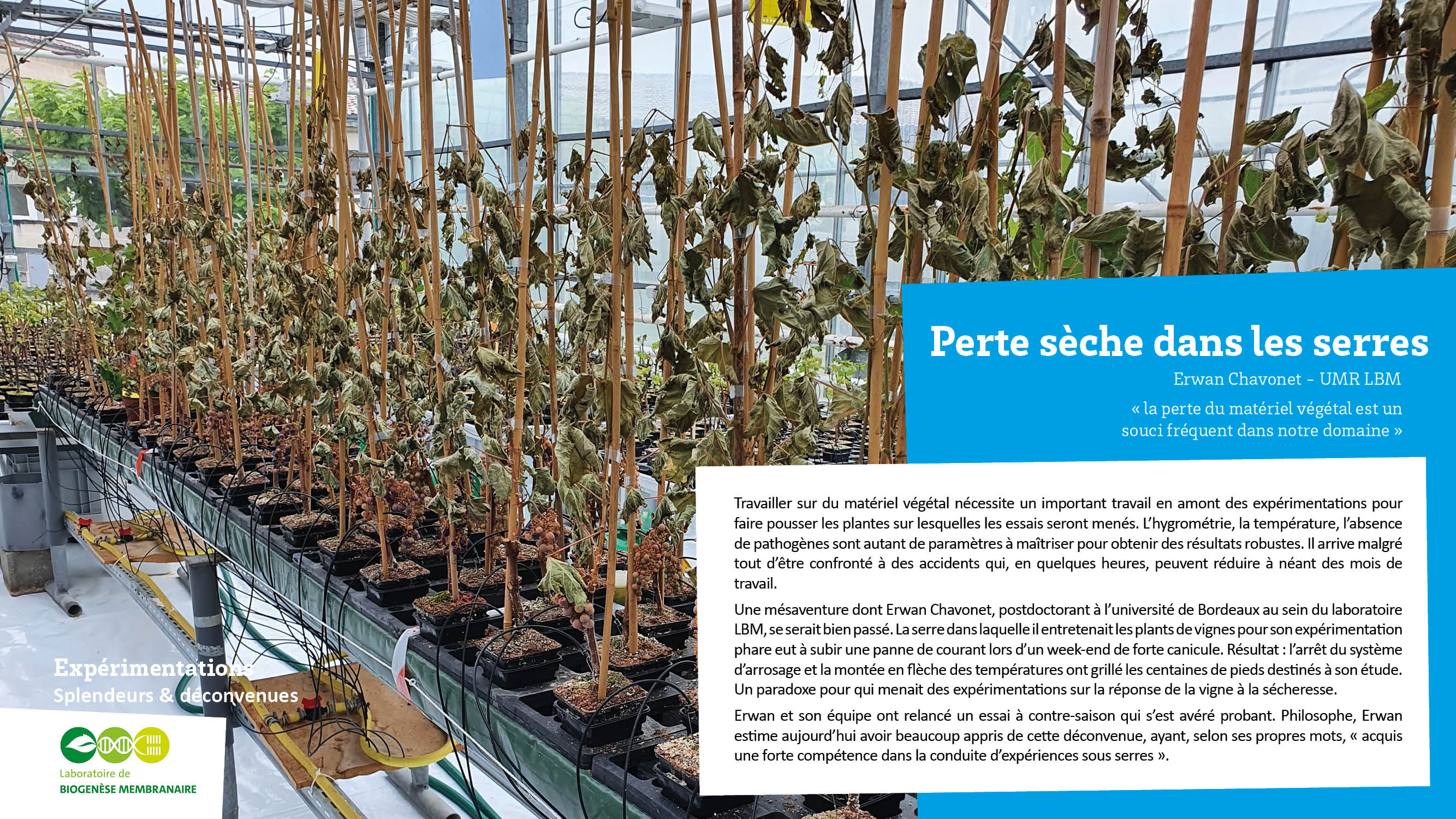 Une mésaventure dont Erwan Chavonet, postdoctorant à l’université de Bordeaux au sein du laboratoire LBM, se serait bien passé. La serre dans laquelle il entretenait les plants de vignes pour son expérimentation phare eut à subir une panne de courant lors d’un week-end de forte canicule. Résultat : l’arrêt du système d’arrosage et la montée en flèche des températures ont grillé les centaines de pieds destinés à son étude. Un paradoxe pour qui menait des expérimentations sur la réponse de la vigne à la sécheresse.