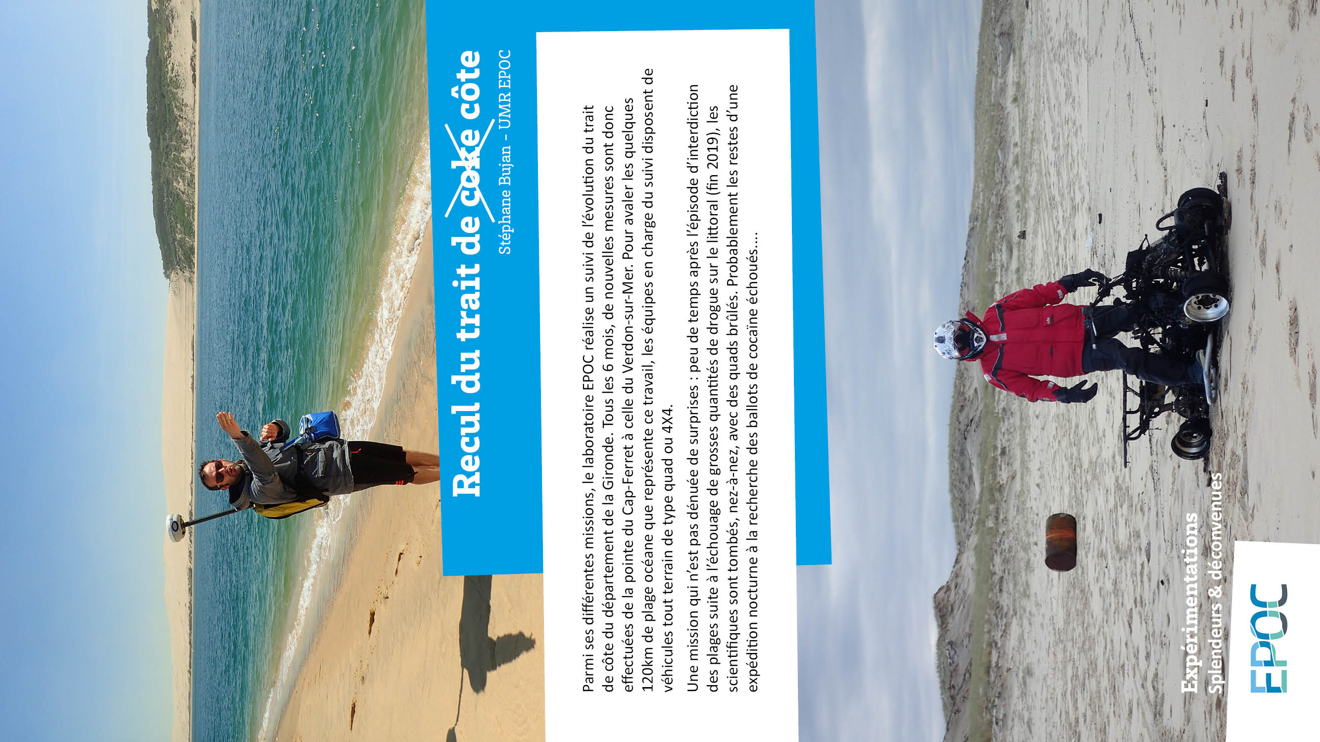 Parmi ses différentes missions, le laboratoire EPOC réalise un suivi de l’évolution du trait de côte du département de la Gironde. Tous les 6 mois, de nouvelles mesures sont donc effectuées de la pointe du Cap-Ferret à celle du Verdon-sur-Mer. Pour avaler les quelques 120km de plage océane que représente ce travail, les équipes en charge du suivi disposent de véhicules tout terrain de type quad ou 4X4.