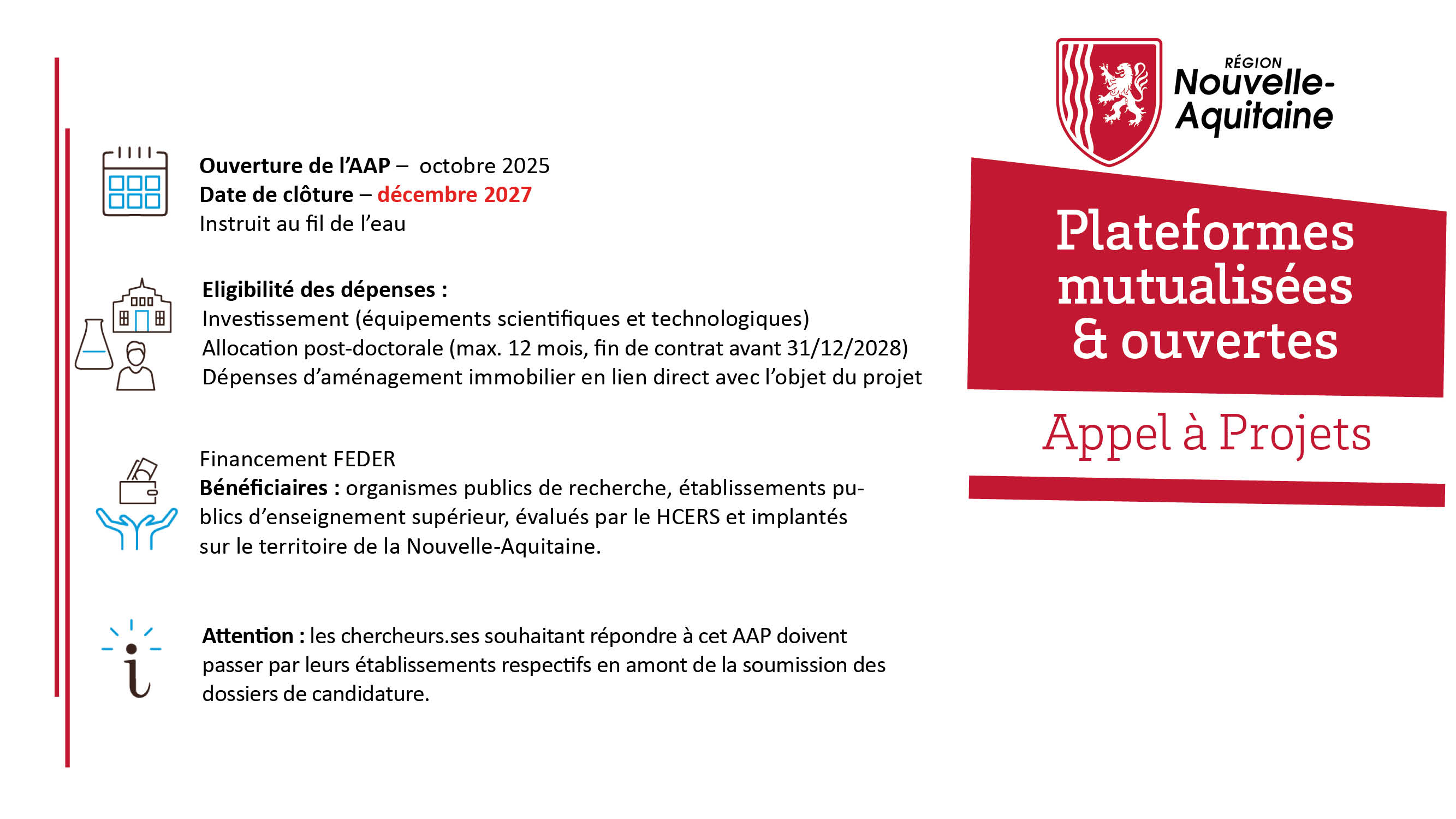 Dans le cas de sa politique de soutien à l'enseignement supérieur et à la recherche, et dans le but de répondre aux défis sociétaux et environnementaux, la Région Nouvelle-Aquitaine déploie son AAP Plateformes mutualisées et ouvertes.
