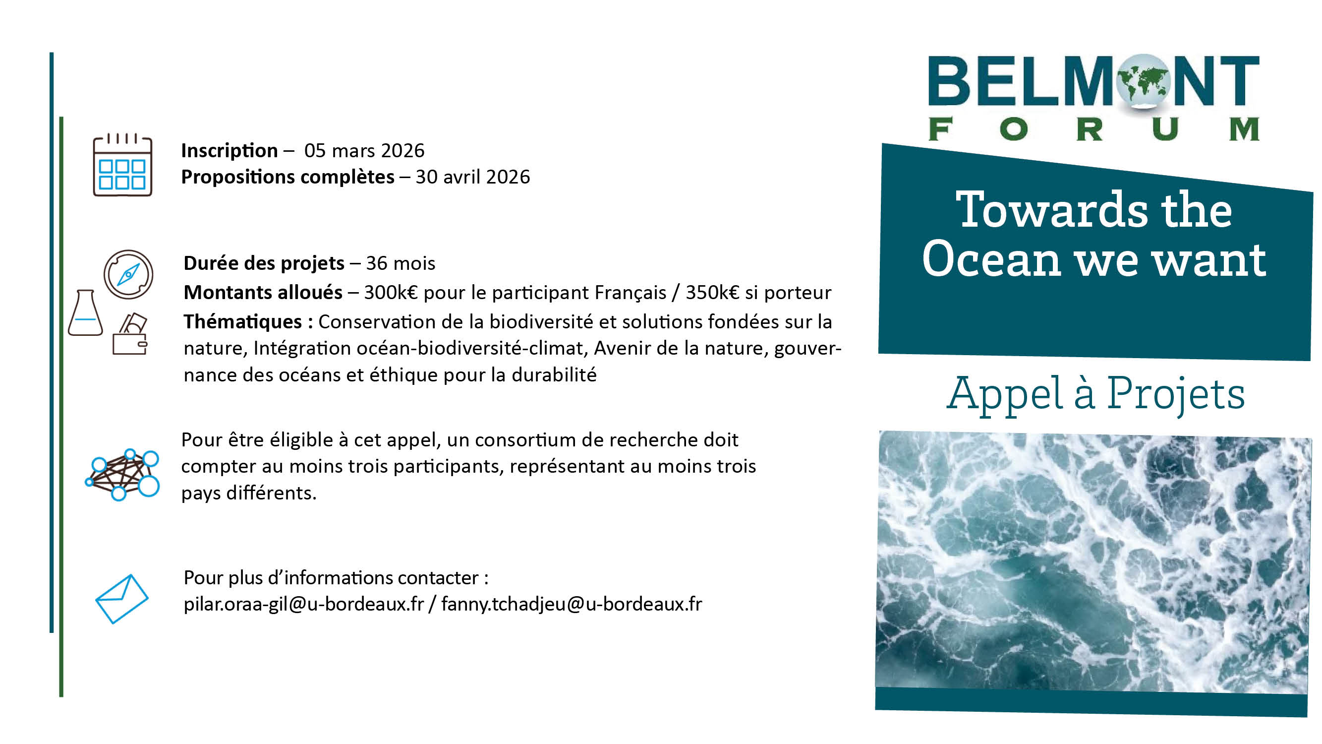 Inscription avant le 05/03/2026 - Propositions avant le 30/04/2026 | AAP du Belmont Ocean's Forum pour des projets de recherche partenariale liés aux océans (biodiversité, conservation, nature-nased solutions, climat, gouvernance...).