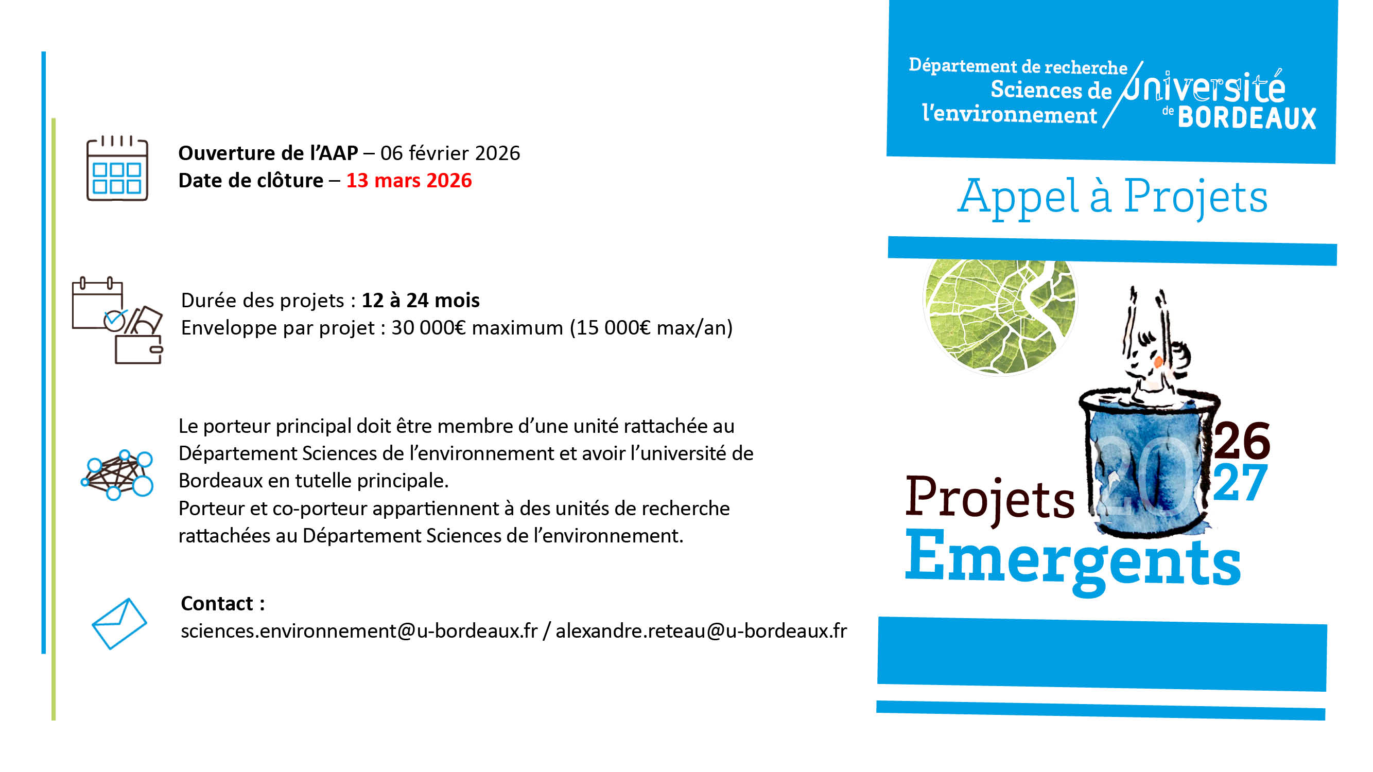 L'appel à propositions Projets émergents est ouvert à l’ensemble des équipes des UMR/UR de rattachées au Département de recherche en Sciences de l'environnement de l'université de Bordeaux.