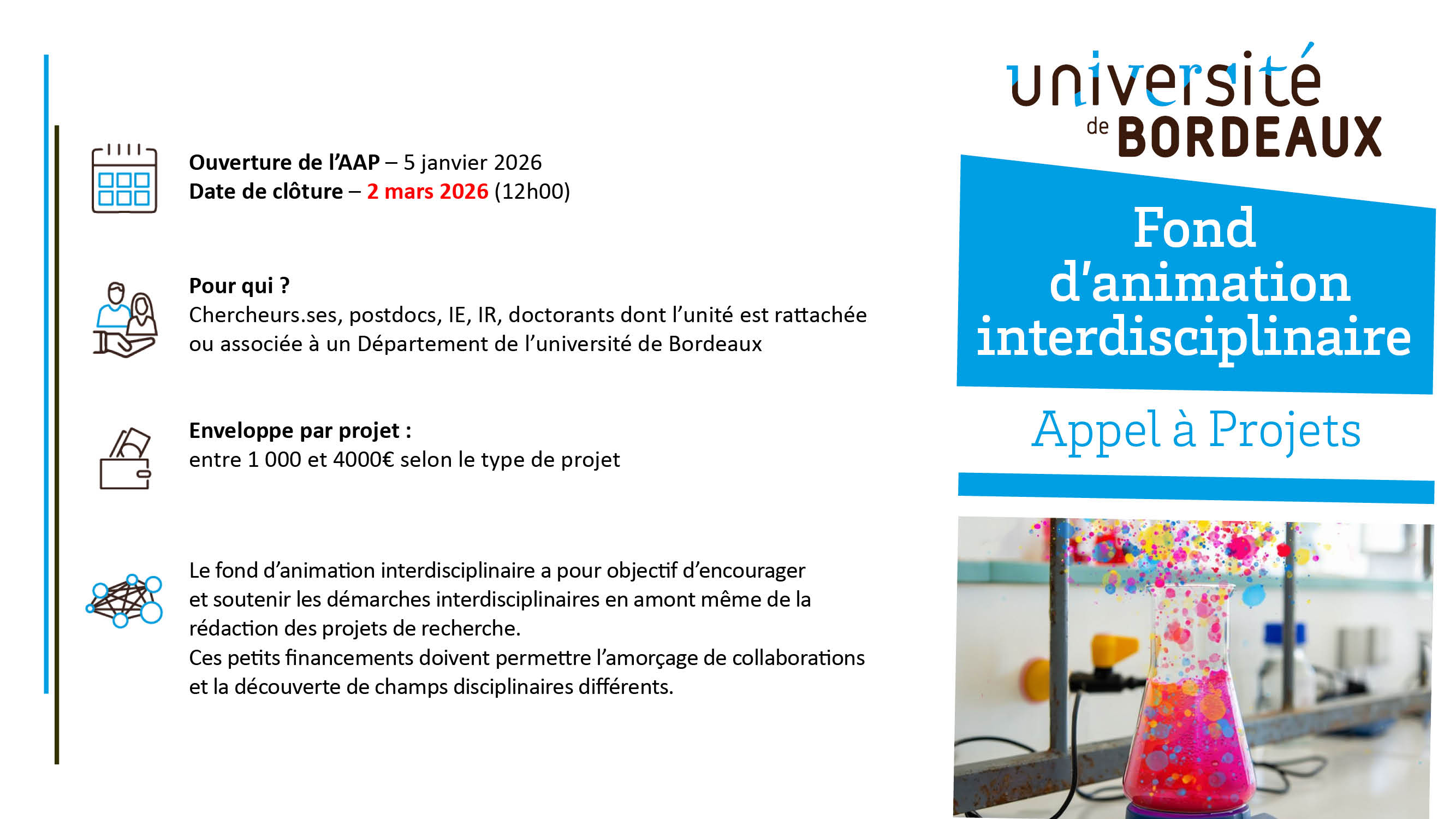 Première phase : jusqu'au 02 mars 2026 | Stimuler et soutenir les projets de recherche interdisciplinaires passe par un accompagnement à toutes les étapes de la démarche scientifique, dès les premières idées et les prémisses de collaboration. C’est pourquoi l’université de Bordeaux s’est dotée d’outils d’accompagnement légers et personnalisés.